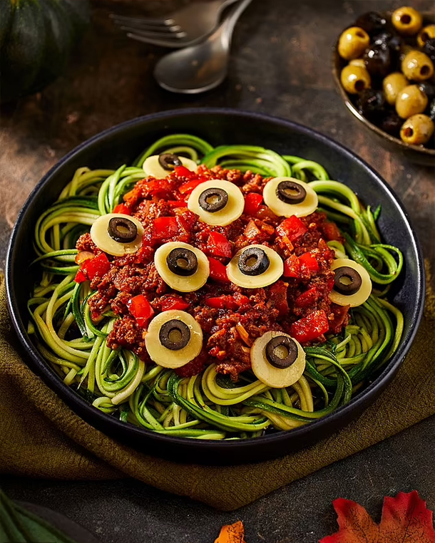 For a spooky touch, cut out small circles from the cheese slices to create 'eyeballs,' topping them with sliced black olives. Serve each bowl of courgetti topped with ghoul-lash sauce, adorned with cheesy olive eyeballs, and a sprinkle of extra cheese if desired.